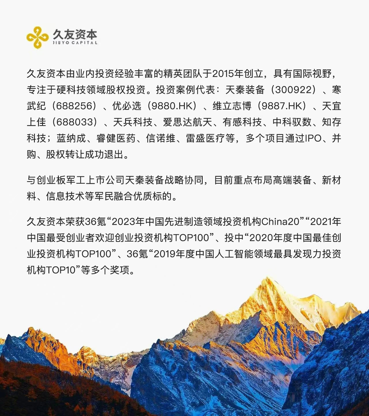久友资本由业内投资经验丰富的精英团队于2015年创立,具有国际视野专注于硬科技领域股权投资。投资案例代表:天秦装备(300922)、寒武纪(688256)、优必选(9880.HK)、维立志博(9887.HK)、天宜上佳(688033)、天兵科技、爱思达航天、有感科技、中科驭数、知存科技;蓝纳成、睿健医药、信诺维、雷盛医疗等,多个项目通过IPO、并购、股权转让成功退出。